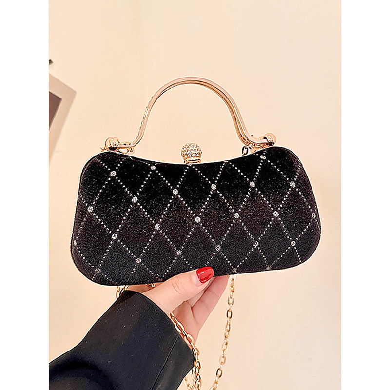 Women's Velvet Quilted Evening Purse with Diamond Accents - Elegant Shoulder Bag for Christmas Party, Holiday Gatherings, and Special Occasions