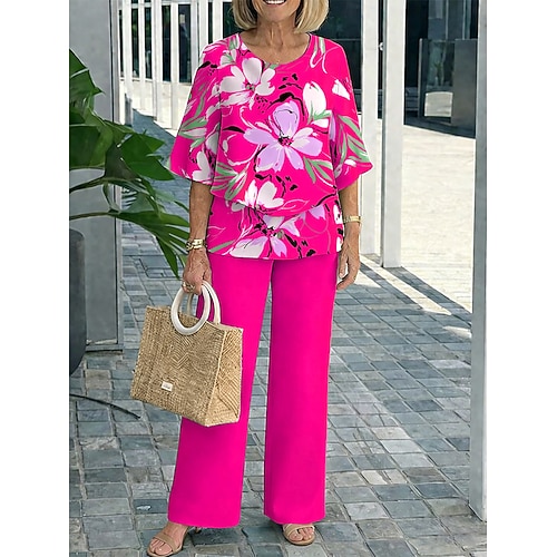 Per donna Set di Pantaloni Manica 3/4 Girocollo Floreale Grafico Elegante Vacanza Casuale Quotidiano Vacanza Blu Fucsia Arancione Estate Vestibilità comoda
