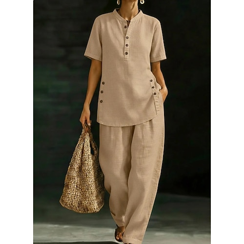 Per donna Set di biancheria in cotone Set di Pantaloni Manica Corta Dolcevita Tinta unica Elegante Moda Streetwear Casuale Quotidiano All'aperto Blu Vino Cachi Primavera Estate Vestibilità comoda