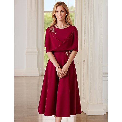 Abito da festa A-Line fino al tè Abito da cocktail Abito da ospite per matrimoni Abito per la madre della sposa con maniche a metà e collo rotondo elegante vintage con pieghe e ricami