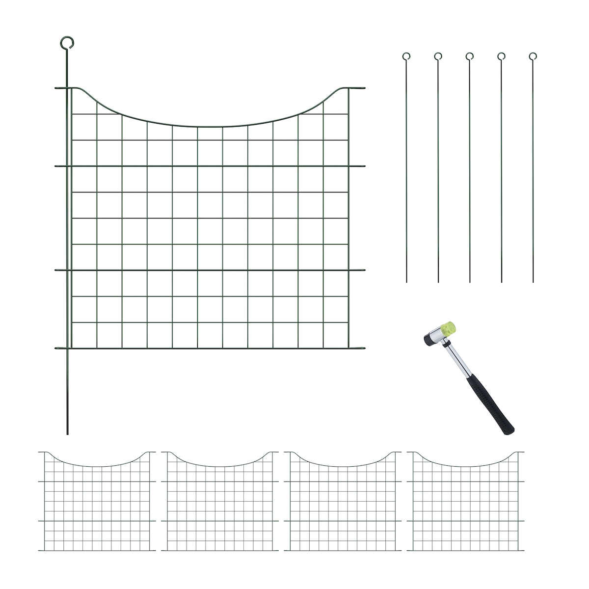 Relaxdays Teichzaun, 5 Zaunelemente, HB je 65x75 cm, Garten, Begrenzungszaun Unterbogen, zum Stecken, Metall, dunkelgrün