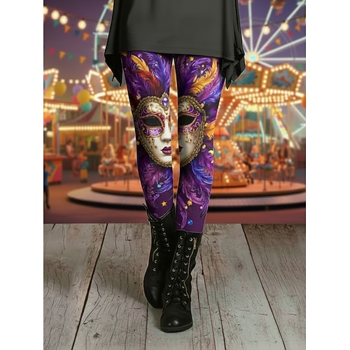 Karnevals-Leggings für Damen, bequeme Leggings im Vintage- und Ethno-Stil, lange Hose mit hohem Bund, Grafikprint, bequem, dehnbar, lässig, für Alltag und Urlaub, in Blau, Weiß, Gelb, Lila, Frühling