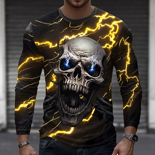 Halloween Herren Schädel Blitz T Shirt Langarm T-Shirt 3D-Druck Rundhalsausschnitt Hemd Mode Übertrieben Straße Lässig Täglich Gelb Blau Grün Sommer Frühling Herbst Bekleidung S M L XL XXL XXXL