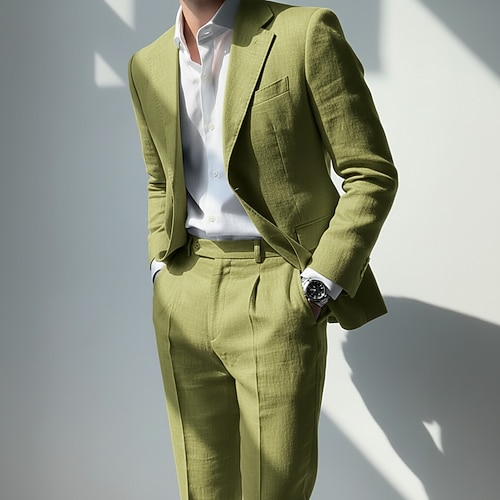Herren Strandhochzeit Leinenanzüge Gekerbtes Revers Himmelblau Khaki Mode Täglich Einfarbig Standard Passform 2-teilig Einreihige Zwei-Knopf-Jacke