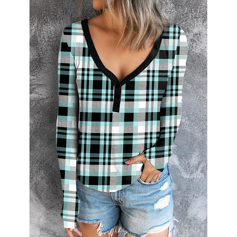 Women's T Shirt Henley Shirt Plaid Fashion Long Sleeve V Neck Regular Tops Daily Weekend Buttons Print Yellow Pink Blue Purple Green Spring Fall