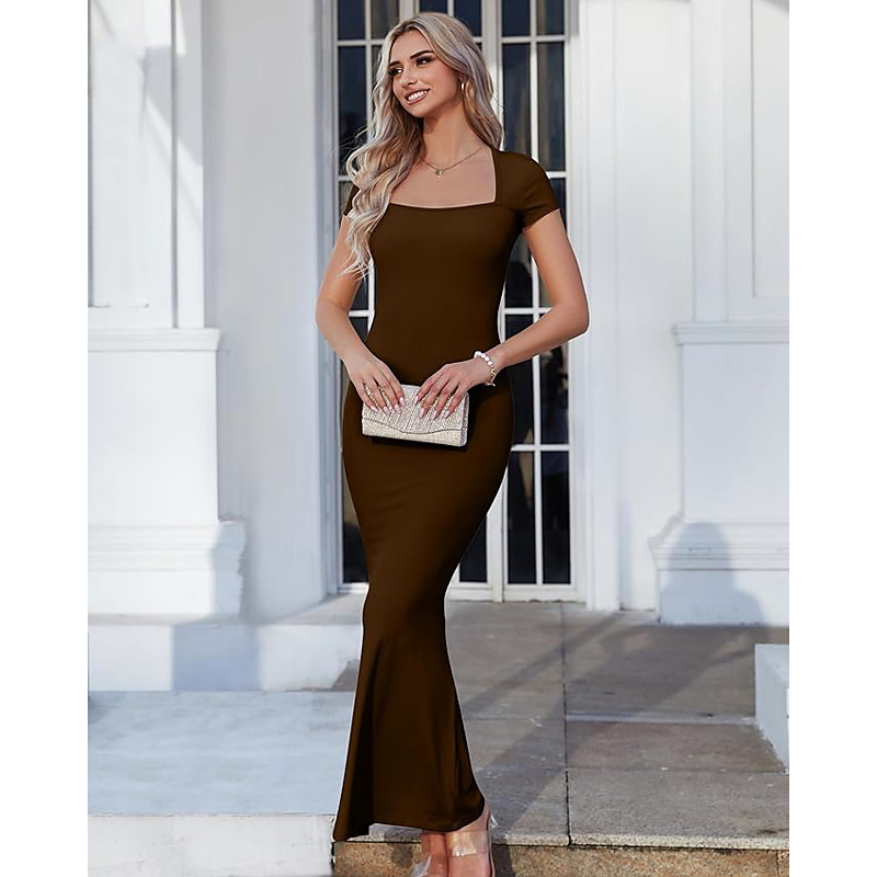 Women's Short Sleeve Square Neck Threaded Slim Fishtail Long Dresses