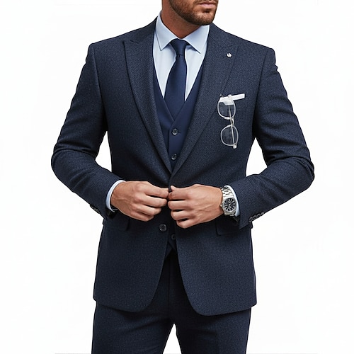 Uomo Matrimonio Affari Completi in Tweed Bavero classico Blu marino Formale Tinta unita Vestibilità aderente 3 pezzi Monopetto a un bottone