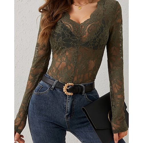 Per donna Blusa Top in pizzo Semplice Elegante Sexy Manica Lunga Scollo a V Top Regolari Quotidiano Ferie Uscire Pizzo Nero Bianco Vino Blu marino Verde smeraldo Autunno Inverno