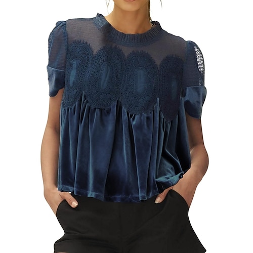 Per donna Velluto Blusa Tinta unica Elegante Manica Corta Girocollo Top Regolari Quotidiano Ferie Uscire Rete Blu Nero Vino Verde militare Arancione Estate Primavera