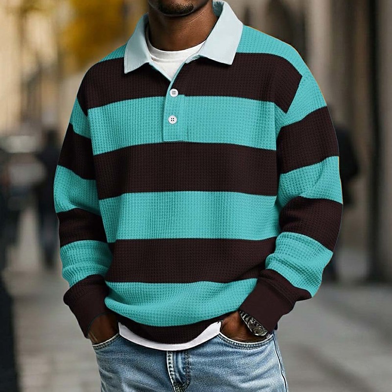 Men's Horizontal Stripes Waffle Polo Shirts Rugby Polo Rugby Polo Shirts Long Sleeve Polo Shirts Lapel Sportswear Casual School Athleisure Daily Wear 3D Print Spring Fall Winter Blue Yellow Purple