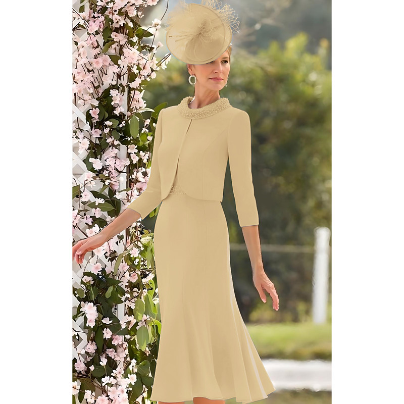 Dress Dress Sets Tea Length Wedding Guest Dress Mother of the Bride Dress 3/4 Length Sleeve High Neck Jewel Neck Elegant Vintage Formal Wedding Guest Stretch Fabric with Lace Pearls