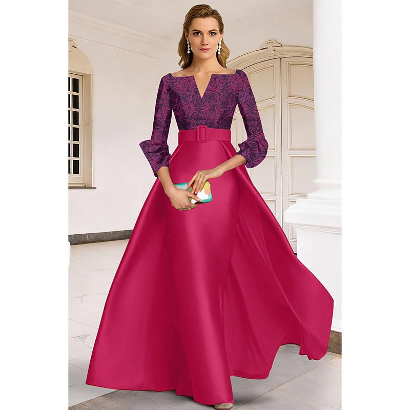 A-Line Floor Length Evening Gown Elegant Floral Mother Of The Bride 3/4 Length Sleeve V Neck Garden Party Wedding Satin Lace with Pleats