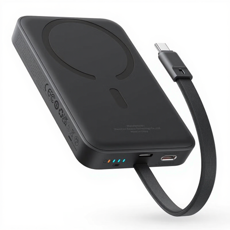 Baseus Magnetische Mini-Powerbank 10.000 mAh, kabelloses Schnellladen, 30 W, mit integriertem USB‑C‑Kabel, schwarz