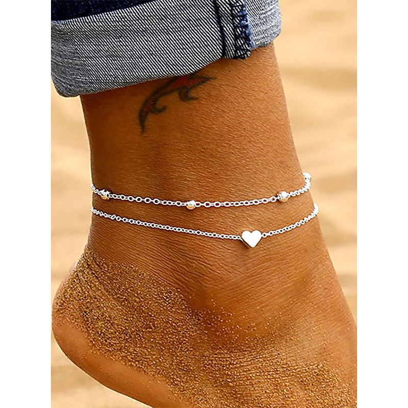 Women's Gold Heart Pendant Double Layer Anklet – Dainty Beach Foot Jewelry with Beaded Chain Design for Summer Outings and Vacation Wear