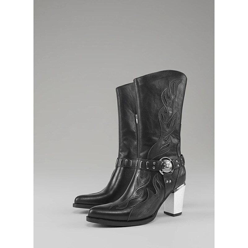 Women's Flame Embroidered Western Cowboy Boots - Chunky Heel Black and Brown Gothic Mid-Calf Boots for Halloween, Music Festivals, and Rodeo Outfits