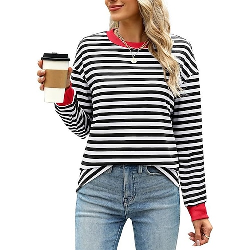Per donna Maglietta A righe Moda Classico Casual Manica Lunga Girocollo Top Regolari Quotidiano Uscire Weekend Bianco e nero Nero Verde chiaro Rosa Blu marino Primavera Autunno
