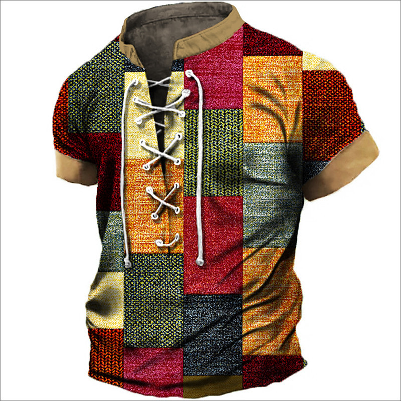 Men's T Shirt Graphic Color Block Plaid / Check Stand Collar Clothing Apparel 3D Print Daily Sports Going out Short Sleeve Lace up Print Polyester Vintage Fashion Designer