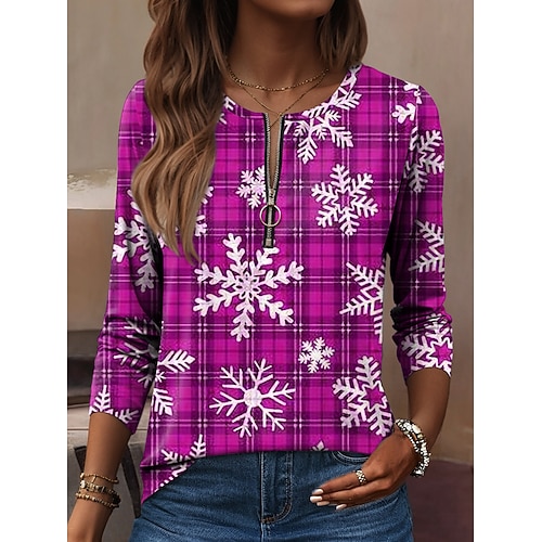 Per donna Maglietta Grafico Plaid Fiocco di neve Vintage Moda Elegante Manica Lunga Girocollo Top Regolari Quotidiano Cerniera Stampato Blu Rosso Viola Verde Primavera Autunno Inverno