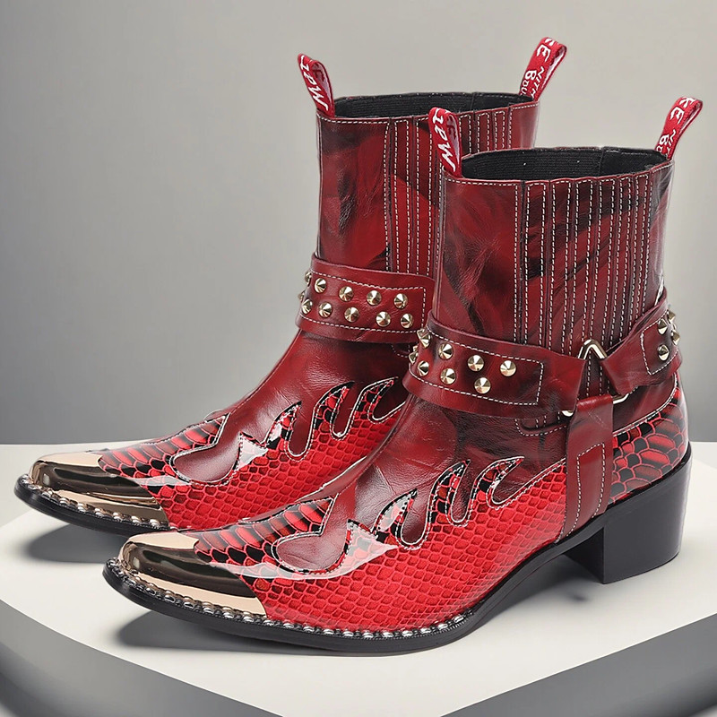Men's Red Snake-Patterned Leather Boots with Metal Toe Cap – Fashionable and Distinctive, Ideal for Bold Looks and Evening Wear