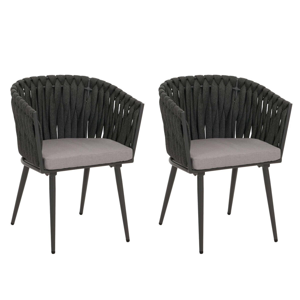 Proregal 2er-Set Aluminium-Gartenstuhl | HxBxT 82x61x57 cm | Sitzhöhe 50cm | Olefin Seilgeflecht Rope | Anthrazit Kissen Hellgrau | Outdoor Stuhl Armlehne