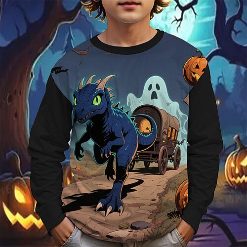 Halloween Jungen 3D Cartoon Kürbis Dinosaurier T-Shirt Langarm Frühling Herbst Mode Basic Kinder 4-12 Jahre Rundhalsausschnitt Outdoor Lässig Täglich Normale Passform