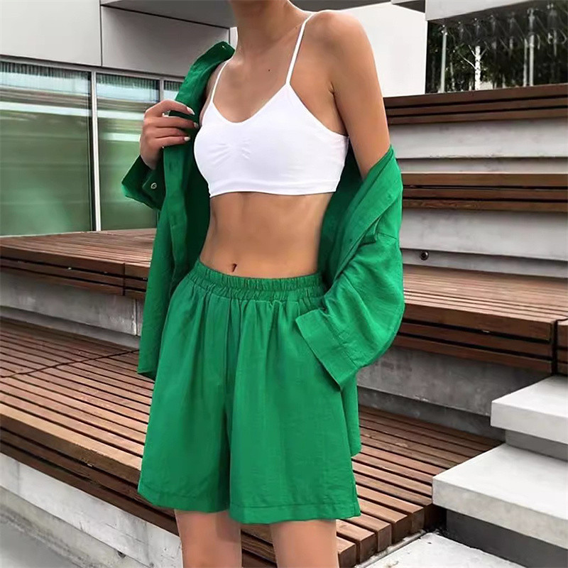 Women's Fashion Streetwear Shirt Cotton Linen Sets Two Piece Sets Long Sleeve Shirt Collar Plain Daily Wear Date White Blue Green Summer Regular Fit