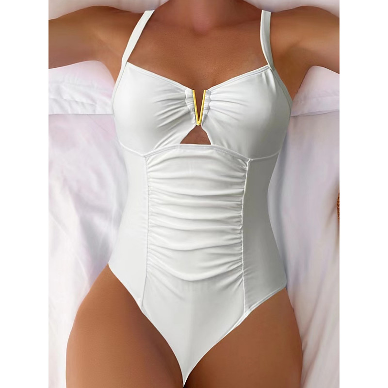 Women's Swimwear One Piece Monokini Swimsuit Ruched Tummy Control High Waist Slim Backless Vacation Beach Wear Stripe V Neck Sleeveless Bathing Suits