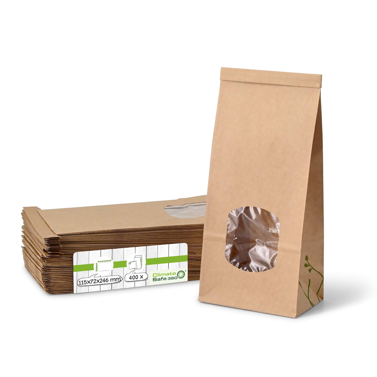 greenbox - Blockbeutel m. Fenster M, 11,5 x 7,2 x 24,6 cm, PLA-Folie, braun, Clipband, Kraftpapier, 400 St.