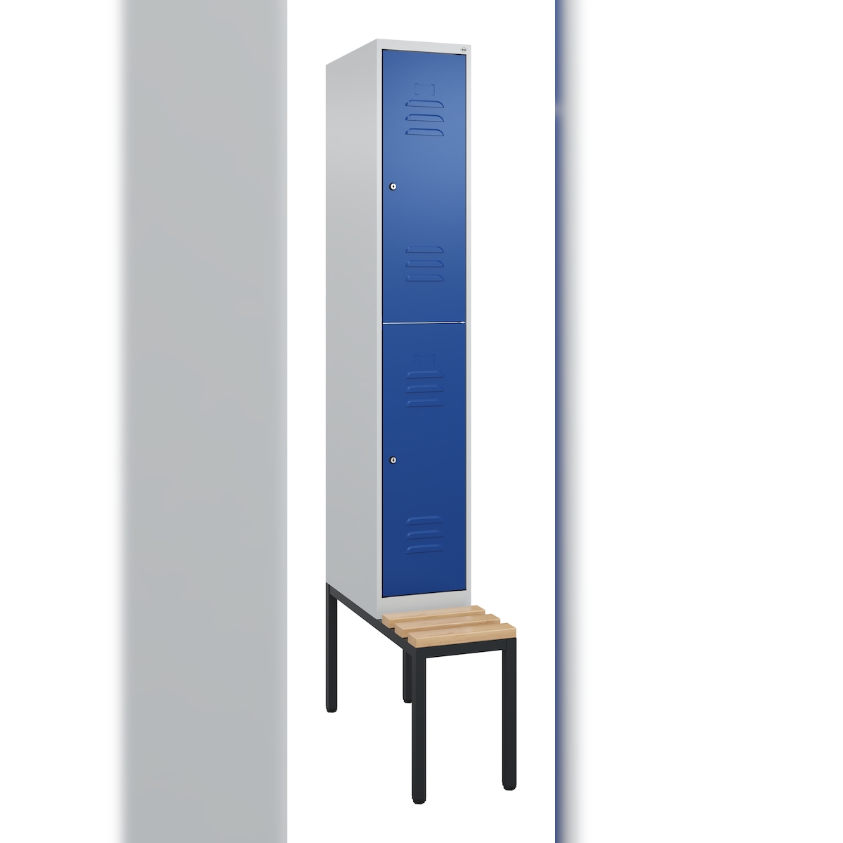 C+P Spind Classic PLUS, Buche untergebaute Sitzbank-Harthol, 2 Abteile, HxBxT 212x30x82cm, Zylinderschloss, Hellgrau/Enzianblau von PROREGAL