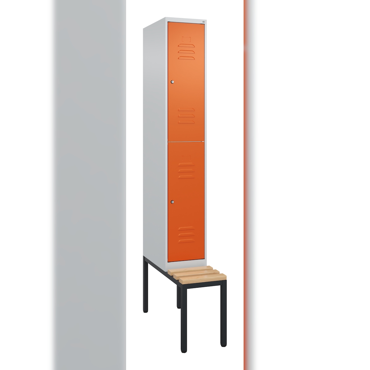 C+P Spind Classic PLUS, Buche untergebaute Sitzbank-Harthol, 2 Abteile, HxBxT 212x30x82cm, Zylinderschloss, Hellgrau/Reinorange von PROREGAL