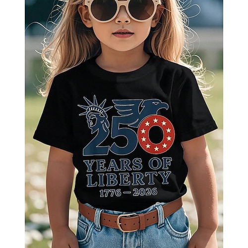 100% Cotone Bambini Ragazze Nero Bianco Grafico Bandiera USA 250° anniversario Bandiera americana per bambini Maglietta Girocollo Manica Corta Vacanza Sport Outdoor Abbigliamento Quotidiano Attivo