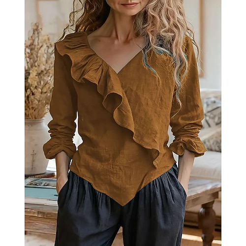 Per donna Blusa Semplice Vintage Elegante Manica Lunga Scollo a V Top Regolari Quotidiano Ferie Uscire Volant Patchwork Nero Rosso Blu marino Verde Cachi Estate Primavera Autunno