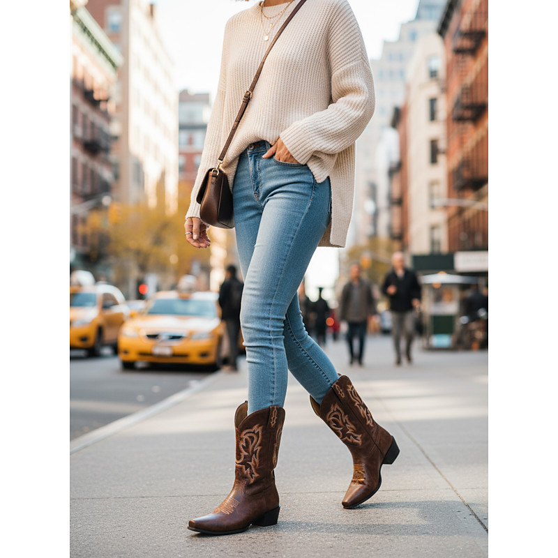 Women's Red Leather Cowboy Boots with Embroidered Western Pattern - Stylish Urban Fashion Footwear for Trendy Outfits