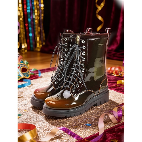 Damen Mardi Gras Blaue Lackleder Kampfstiefel mit Chunky Sohle und Schnürdesign – Kühnes Schuhwerk für Karneval Festivals und legere Ausflüge