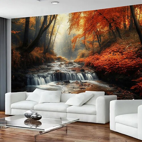 Arazzo da parete con cascata nella foresta autunnale, grande decorazione murale panoramica, coperta, tenda, sfondo fotografico per casa, camera da letto, soggiorno, ufficio, decorazione murale