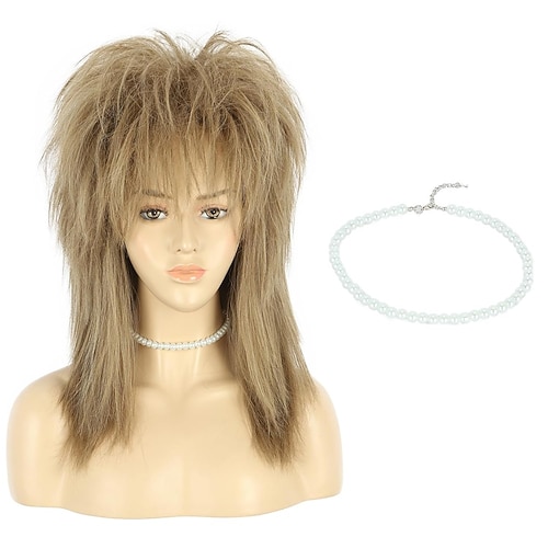 Parrucca mullet anni '70 e '80 da donna, lunghezza spalle, castana liscia, con collana, per cosplay, feste in discoteca, costume di Halloween