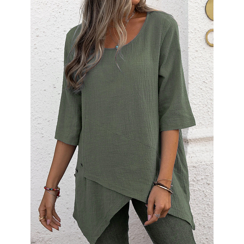 Shirt Blouse Cotton Linen Shirts Women's Blue Green Gray Plain Asymetric Hem Street Daily Fashion Round Neck Regular Fit S