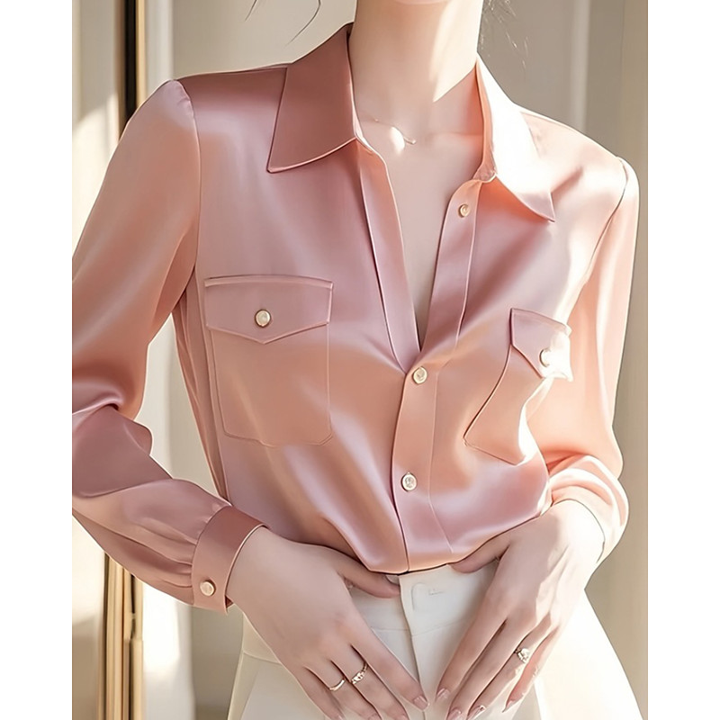 Women's Shirt Elegant Dressy Satin Plain Active Stylish Long Sleeve Shirt Collar Regular Tops Work Formal Wear Pocket Buttons Pink Fall