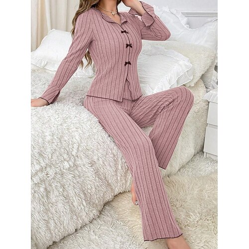 Per donna Set Pigiama Casual Comfort Colore Puro Nodo da legare Elastico in vita Pantalone Quotidiano Casa Manica Lunga Bavero Nero Rosa Beige Grigio Primavera Autunno Inverno Vestibilità regolare