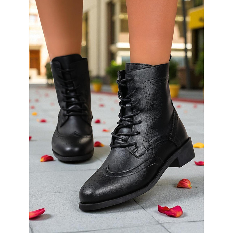 Women's 1950s Vintage Black White Faux Leather Lace-Up Brogue Ankle Boots, Perfect for Street Style Casual Office Wear