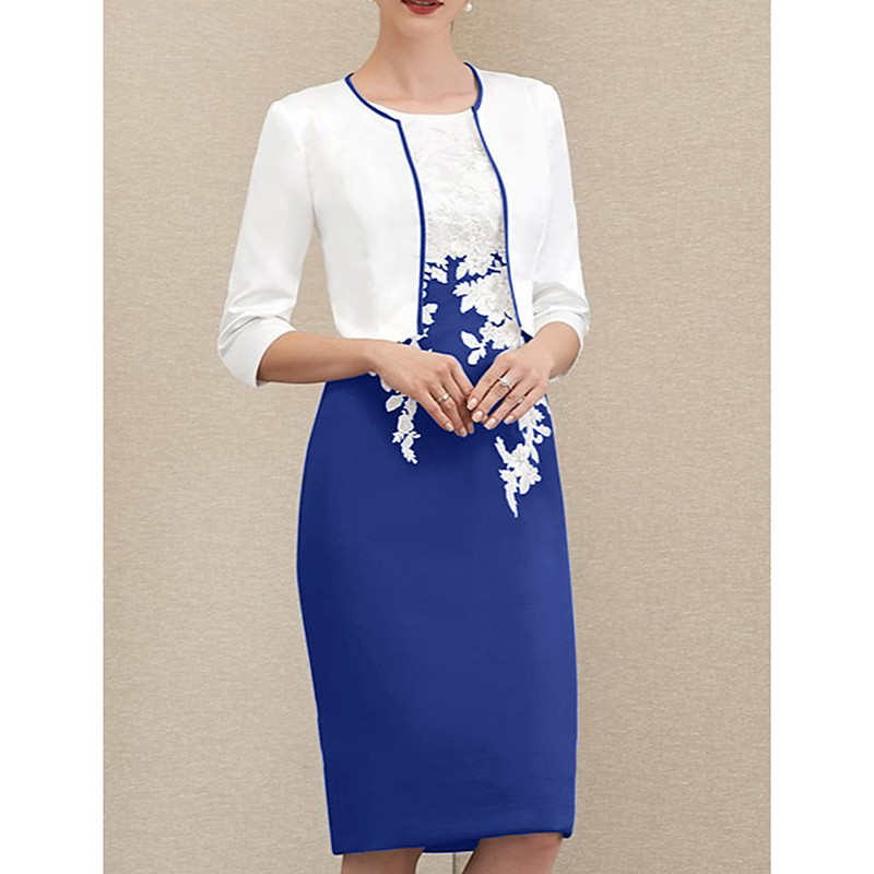 Two Piece Sheath Column Knee Length Wedding Guest Dress Mother of the Bride Dress 3/4 Length Sleeve Jewel Neck Elegant Formal Wedding Guest Church Chiffon Lace Wrap Included Jacket Dresses with