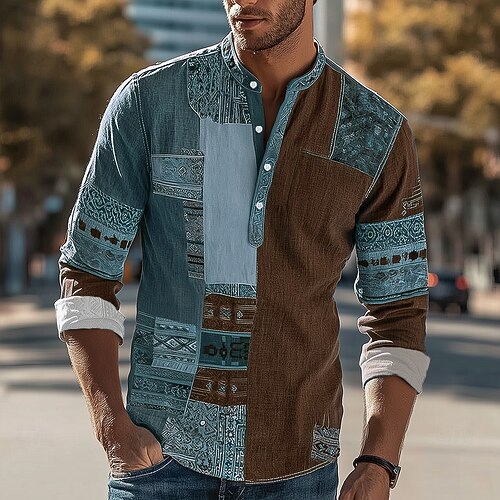 Per uomo Geometrico Blocco di colori Patchwork Camicia Maglia Henley Camicia con colletto alla coreana Manica Lunga Vintage Retrò Vacanza Casuale Estate Primavera Mandarino Bottoni Camicia tipo lino