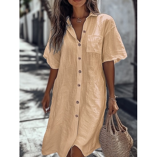abito in cotone da donna, abito lungo fino al ginocchio, abito a trapezio, abito casual, moda, moderno, quotidiano, weekend, vestibilità ampia, semplice, manica corta, colletto camicia, blu, bianco,