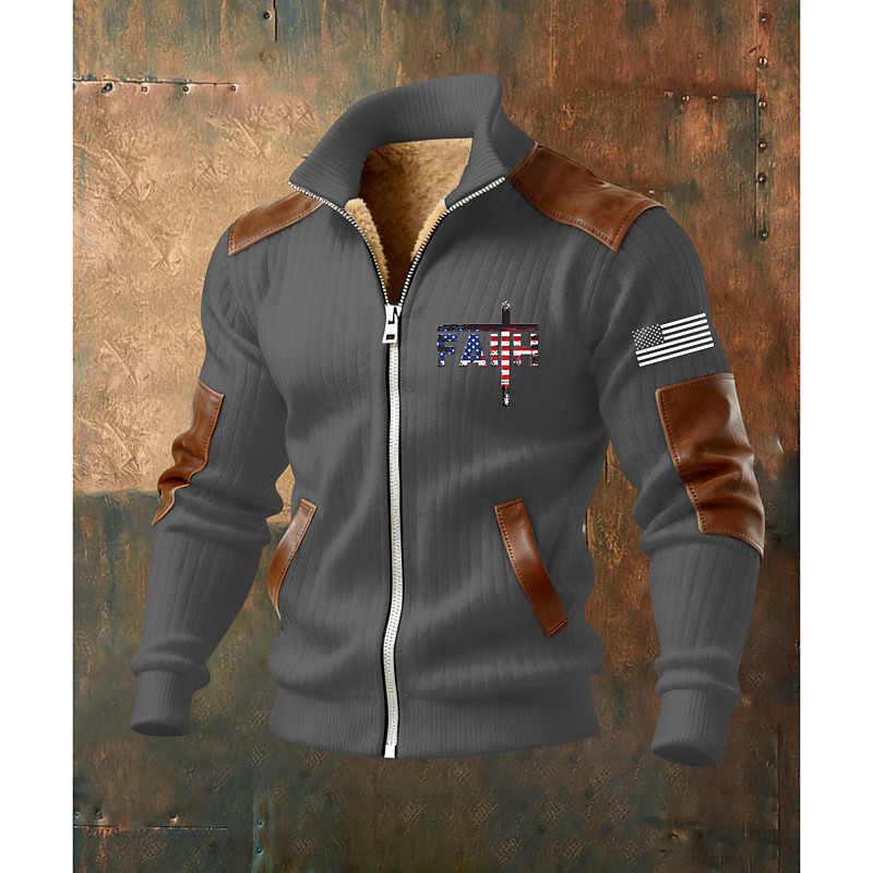 Men's Full Zip Hoodie Fleece Jacket Fleece Hoodie Black White Army Green Navy Blue Brown Standing Collar Cross American Flag Faith Pocket Faux Leather Accents Sports Outdoor Casual Daily Polyester