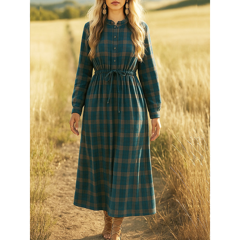 Women's Midi Dress A Line Dress Casual Daily Regular Fit Plaid 3/4 Length Sleeve Crew Neck Blue Red Brown Spring Fall Winter