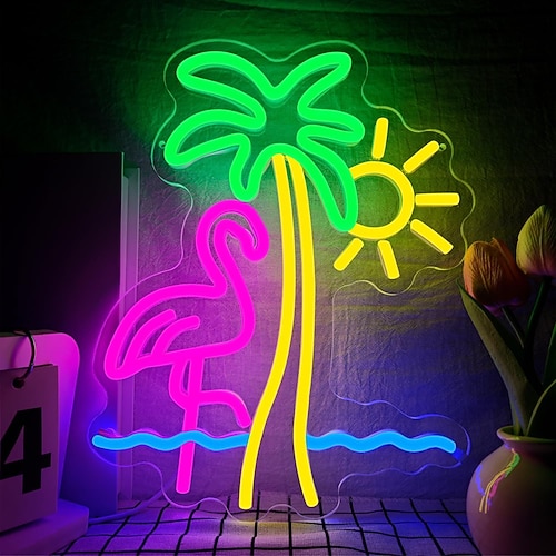fenicottero, cocktail, palma Insegna al neon a onda da parete, alimentata tramite USB, luce LED dimmerabile con opzioni di colore per interni, camera da letto, soggiorno, sala giochi, bar, feste,