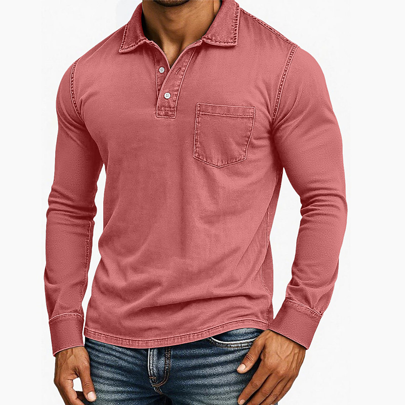 Men's Cotton Polo Shirt Golf Polos Shirts Casual Business Classic Long Sleeve Vintage Basic Solid Color Pocket Fall Winter Cross-Seasons Regular Fit Dark Brown Black Light Green Pink Navy Blue Purple