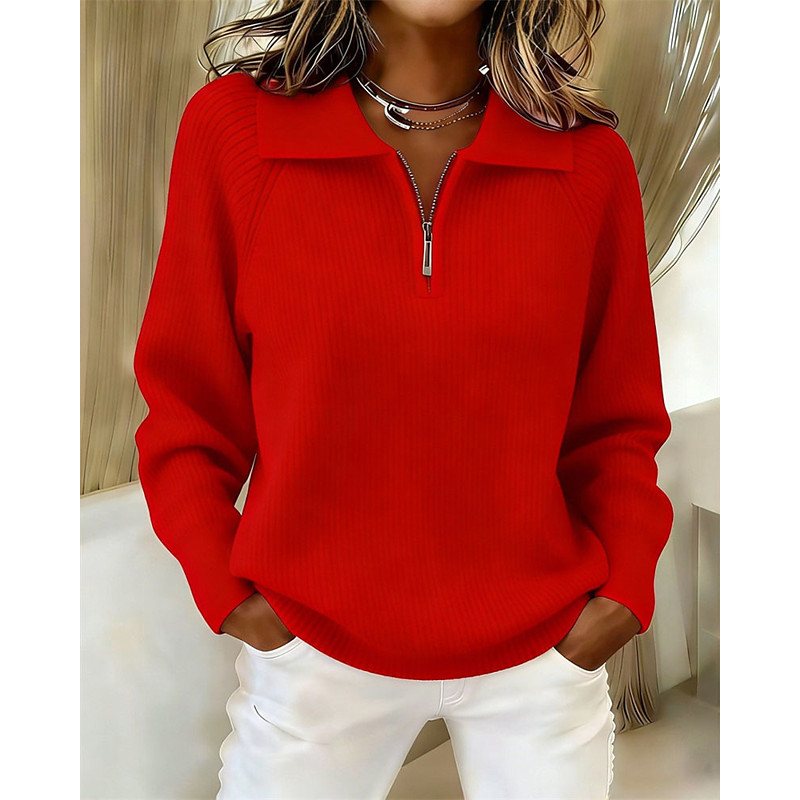 Women's Sweater Pullover Elegant Vintage Fashion Solid Color Polo Collar Patchwork Zipper Knitted Raglan Sleeves Long Sleeve Regular Tops Knit Daily Home Outdoor Pink Red Fall Winter