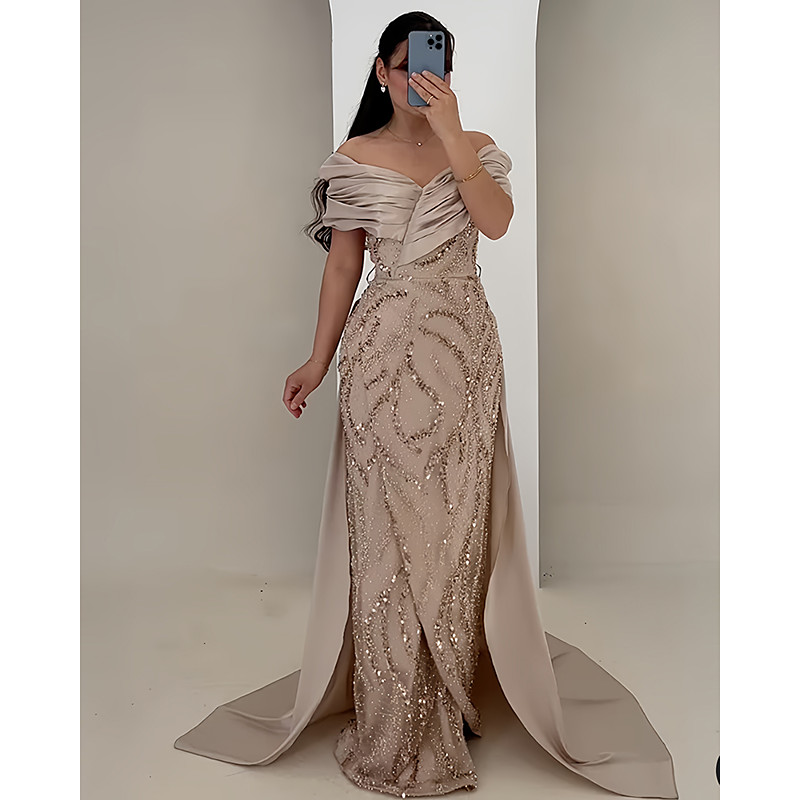 A-Line Floor Length Evening Gown Ball Gown with Overskirt Formal Dress Elegant High Split Short Sleeve Off Shoulder Wedding Formal Satin with Glitter Ruched Crystals