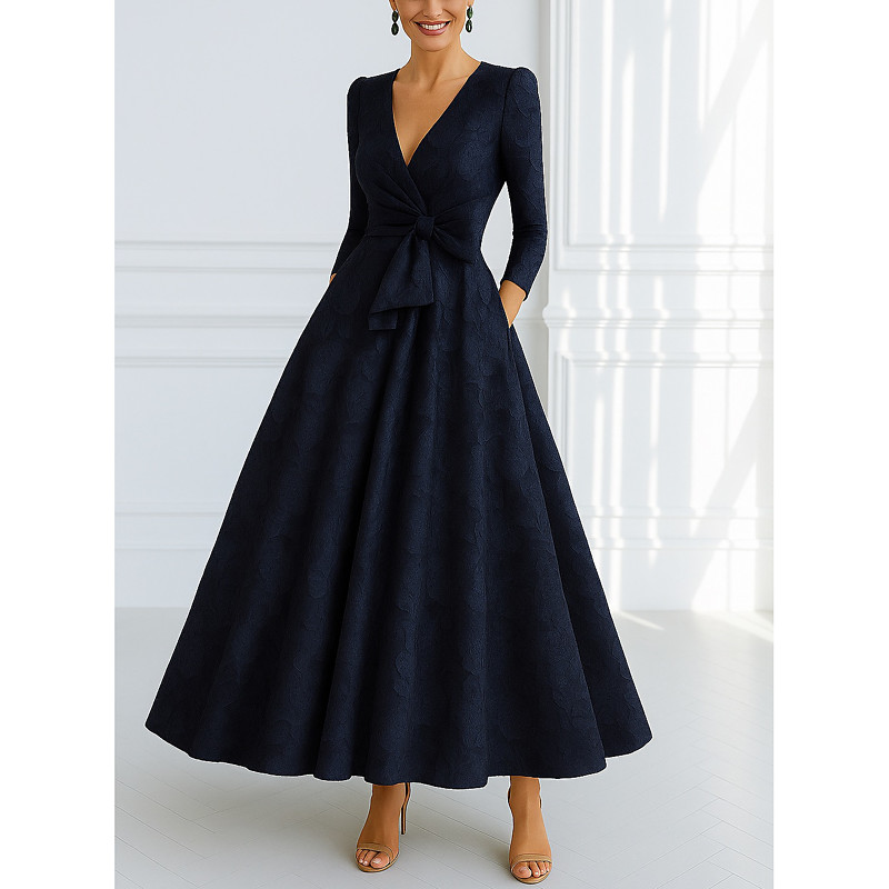 A-Line Floor Length Evening Gown Ball Gown Formal Dress Elegant Vintage Half Sleeve V Neck Wedding Formal Pocket Lace with Bow(s) Strappy